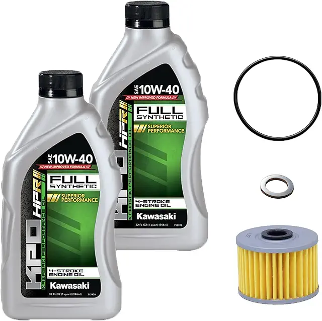 Maintain your KLX 110 motorcycle with this comprehensive oil change kit. It includes two quarts of full synthetic 10W-40 engine oil, designed for superior performance even in demanding conditions. The kit also comes with a new oil filter and sealing washer for a complete oil change. Ensure your bike runs smoothly and efficiently by replacing the old oil and filter regularly.
