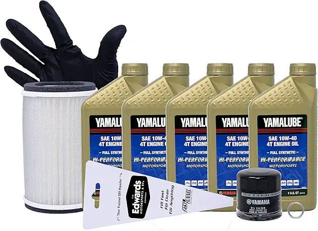 Yamalube SAE 10W40 4T Hi-Performance full synthetic oil is a modern balanced formulation designed for superior performance and maximum durability that is necessary for today’s advanced, high revving engine parts. Yamaha air cleaner offers optimized filtration while maximizing airflow. Genuine OEM Yamaha. Full-Synthetic high performance engine oil. Formulated for superior performance and durability. Designed to provide excellent thermal stability and enhanced fuel efficiency. Enhanced engine performance and protection for any on and off-road application. Includes: five quarts of 10W-40 all full synthetic engine oil, OEM air filter, OEM oil filter, crush washer, pair of nitrile gloves, and funnel