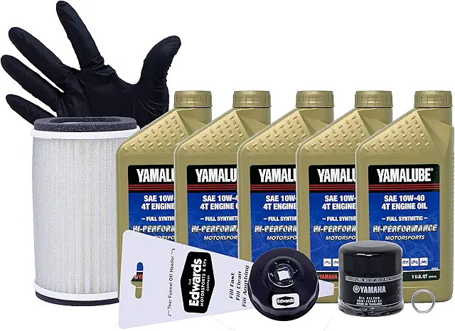 Yamalube SAE 10W40 4T Hi-Performance full synthetic oil is a modern balanced formulation designed for superior performance and maximum durability that is necessary for today’s advanced, high revving engine parts. Yamaha air cleaner offers optimized filtration while maximizing airflow. Genuine OEM Yamaha. Full-Synthetic high performance engine oil. Formulated for superior performance and durability. Designed to provide excellent thermal stability and enhanced fuel efficiency. Enhanced engine performance and protection for any on and off-road application. Includes: five quarts of 10W-40 all full synthetic engine oil, OEM air filter, OEM oil filter, crush washer, oil filter wrench, pair of nitrile gloves, and funnel