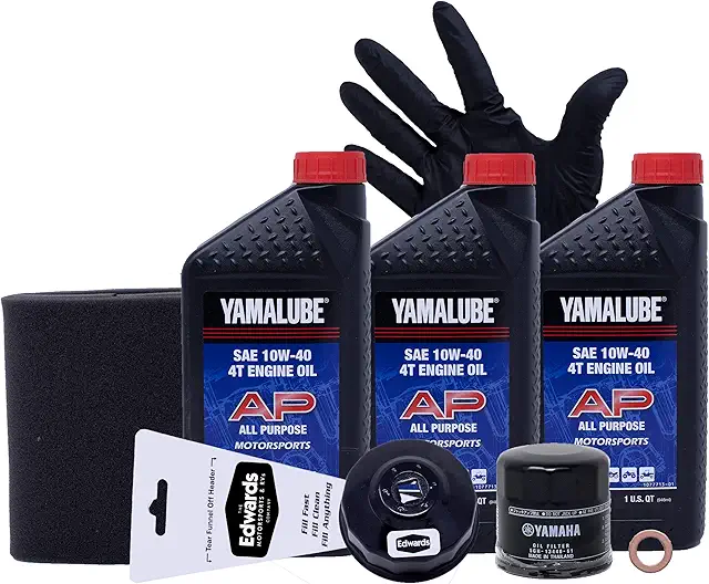 Yamalube SAE 10W-40 4T all purpose engine oil is performance blended mineral oil using high quality base stocks for use in motorcycles, ATVs, side x sides, and scooters. Yamaha air cleaner offers optimized filtration while maximizing airflow. Genuine OEM Yamaha. Formulated with high-quality mineral base oils. Blended for all temperature environments for motorsports products. Advanced friction protection, lubrication and detergency for superior performance. JASO MA-certified. Factory-approved, purpose-built for motorsports products. Includes: three quarts of 10W-40 all purpose engine oil, OEM air filter, OEM oil filter, crush washer, pair of nitrile gloves, and funnel