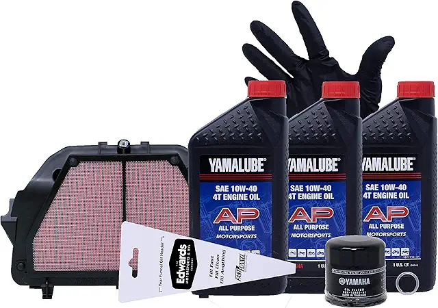Yamalube SAE 10W-40 4T all purpose engine oil is performance blended mineral oil using high quality base stocks for use in motorcycles, ATVs, side x sides, and scooters. Genuine OEM Yamaha. Formulated with high-quality mineral base oils. Blended for all temperature environments for motorsports products. Advanced friction protection, lubrication and detergency for superior performance. JASO MA-certified. Factory-approved, purpose-built for motorsports products. Includes: three quarts of 10W-40 all purpose engine oil, OEM oil filter, OEM air filter, crush washer, pair of nitrile gloves, and funnel