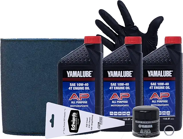 Yamalube SAE 10W-40 4T all purpose engine oil is performance blended mineral oil using high quality base stocks for use in motorcycles, ATVs, side x sides, and scooters. Genuine OEM Yamaha. Formulated with high-quality mineral base oils. Blended for all temperature environments for motorsports products. Advanced friction protection, lubrication and detergency for superior performance. JASO MA-certified. Factory-approved, purpose-built for motorsports products. Includes: three quarts of 10W-40 all purpose engine oil, OEM oil filter, OEM air filter, crush washer, pair of nitrile gloves, and funnel