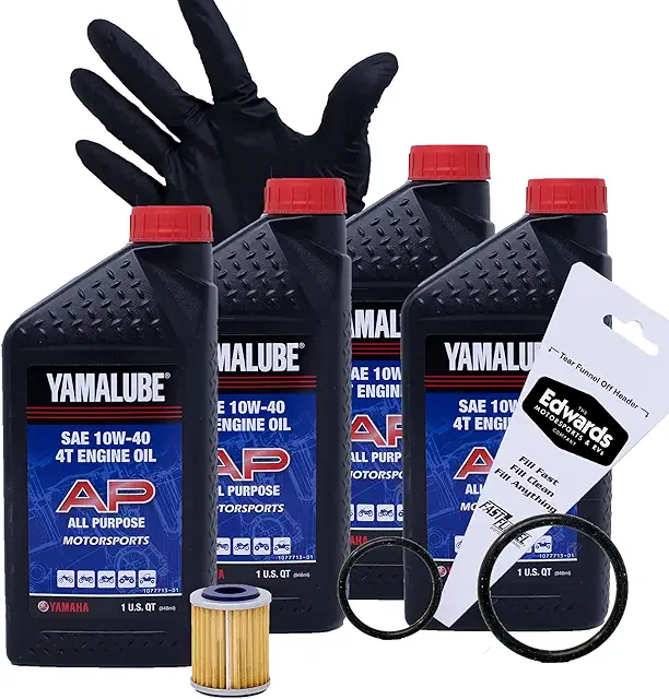 1995 – 2005 Yamaha Wolverine 350 oil change kit. Yamalube SAE 10W-40 4T all purpose engine oil is performance blended mineral oil using high quality base stocks for use in motorcycles, ATVs, side x sides, and scooters. Genuine OEM Yamaha. Formulated with high-quality mineral base oils. Blended for all temperature environments for motorsports products. Advanced friction protection, lubrication and detergency for superior performance. JASO MA-certified. Factory-approved, purpose-built for motorsports products. Includes: three quarts of 10W-40 all purpose engine oil, o-rings, pair of nitrile gloves, and funnel