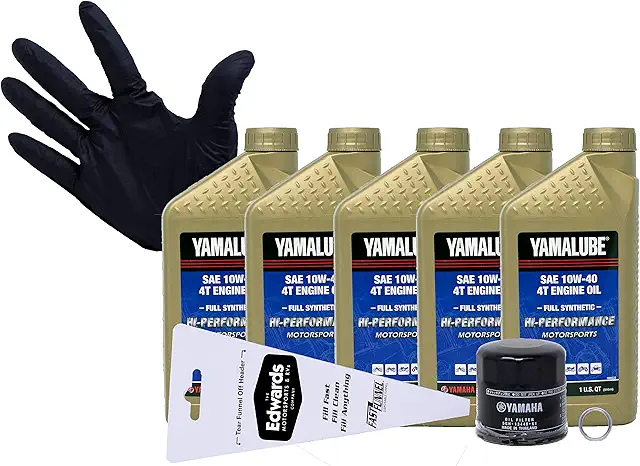 Yamalube SAE 10W40 4T Hi-Performance full synthetic oil is a modern balanced formulation designed for superior performance and maximum durability that is necessary for today’s advanced, high revving engine parts. Genuine OEM Yamaha. Full-Synthetic high performance engine oil. Formulated for superior performance and durability. Designed to provide excellent thermal stability and enhanced fuel efficiency. Enhanced engine performance and protection for any on and off-road application. Includes: five quarts of 10W-40 all full synthetic engine oil, OEM oil filter, crush washer, pair of nitrile gloves, and funnel