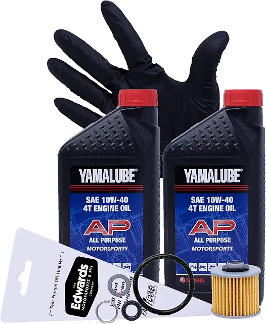 Yamalube SAE 10W-40 4T all purpose engine oil is performance blended mineral oil using high quality base stocks for use in motorcycles, ATVs, side x sides, and scooters. Genuine OEM Yamaha. Formulated with high-quality mineral base oils. Blended for all temperature environments for motorsports products. Advanced friction protection, lubrication and detergency for superior performance. JASO MA-certified. Factory-approved, purpose-built for motorsports products. Includes: two quarts of 10W-40 all purpose engine oil, OEM oil filter, o-rings, crush washers pair of nitrile gloves, and funnel