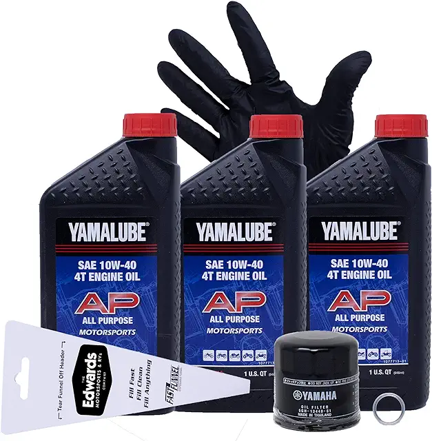 Yamalube SAE 10W-40 4T all purpose engine oil is performance blended mineral oil using high quality base stocks for use in motorcycles, ATVs, side x sides, and scooters. Genuine OEM Yamaha. Formulated with high-quality mineral base oils. Blended for all temperature environments for motorsports products. Advanced friction protection, lubrication and detergency for superior performance. JASO MA-certified. Factory-approved, purpose-built for motorsports products. Includes: three quarts of 10W-40 all purpose engine oil, OEM oil filter, crush washer, pair of nitrile gloves, and funnel